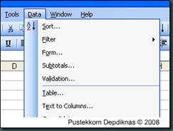 Menu Data memuat perintah-perintah yang berhubungan dengan pengaturan data. Perintah yang terdapat di menu Data antara lain: Sort, Filter, SubTotal, Table, TexttoColumn dan lain-lain seperti terlihat pada Gambar 4.11